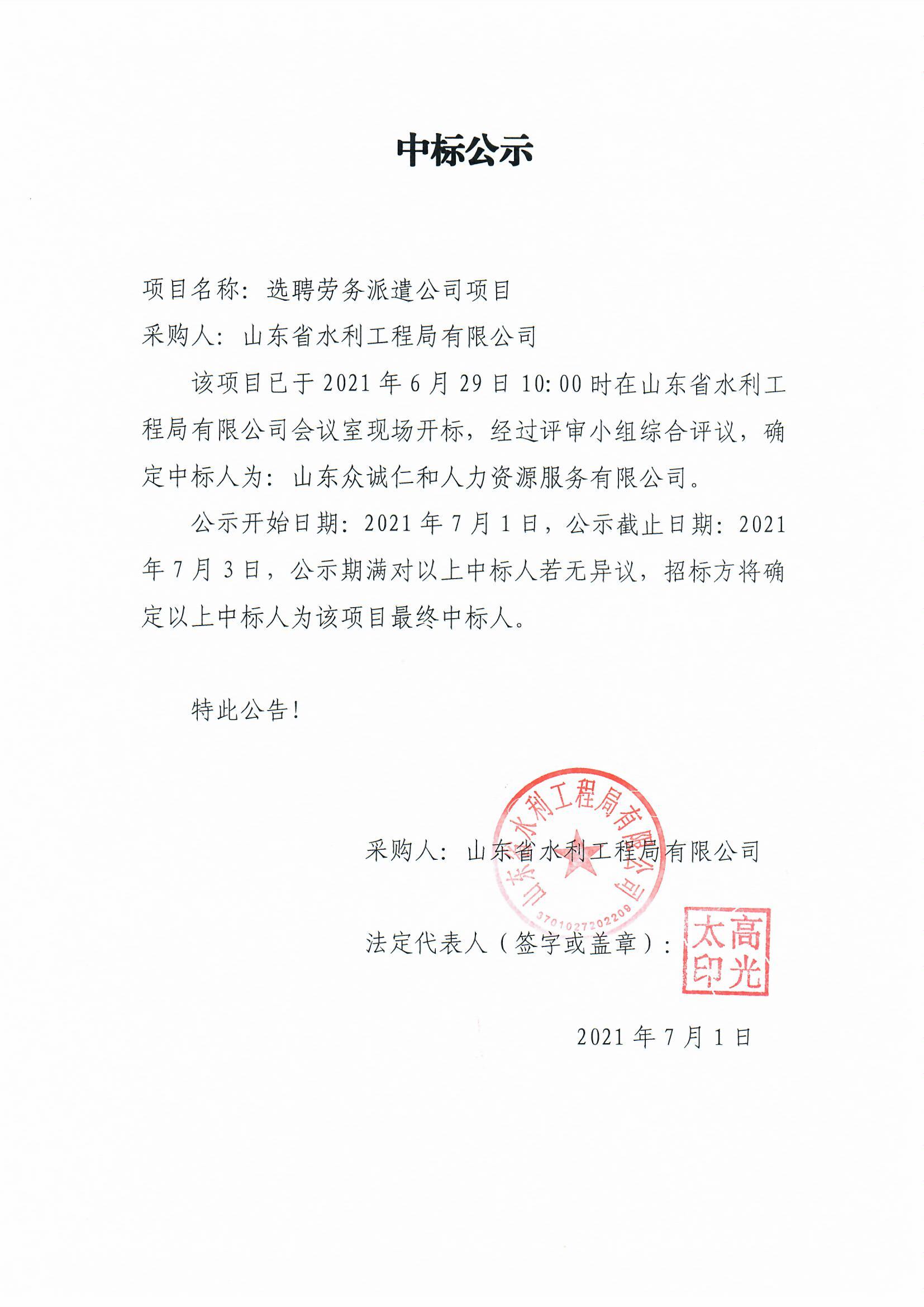 選聘勞務(wù)派遣公司項目中標(biāo)公示