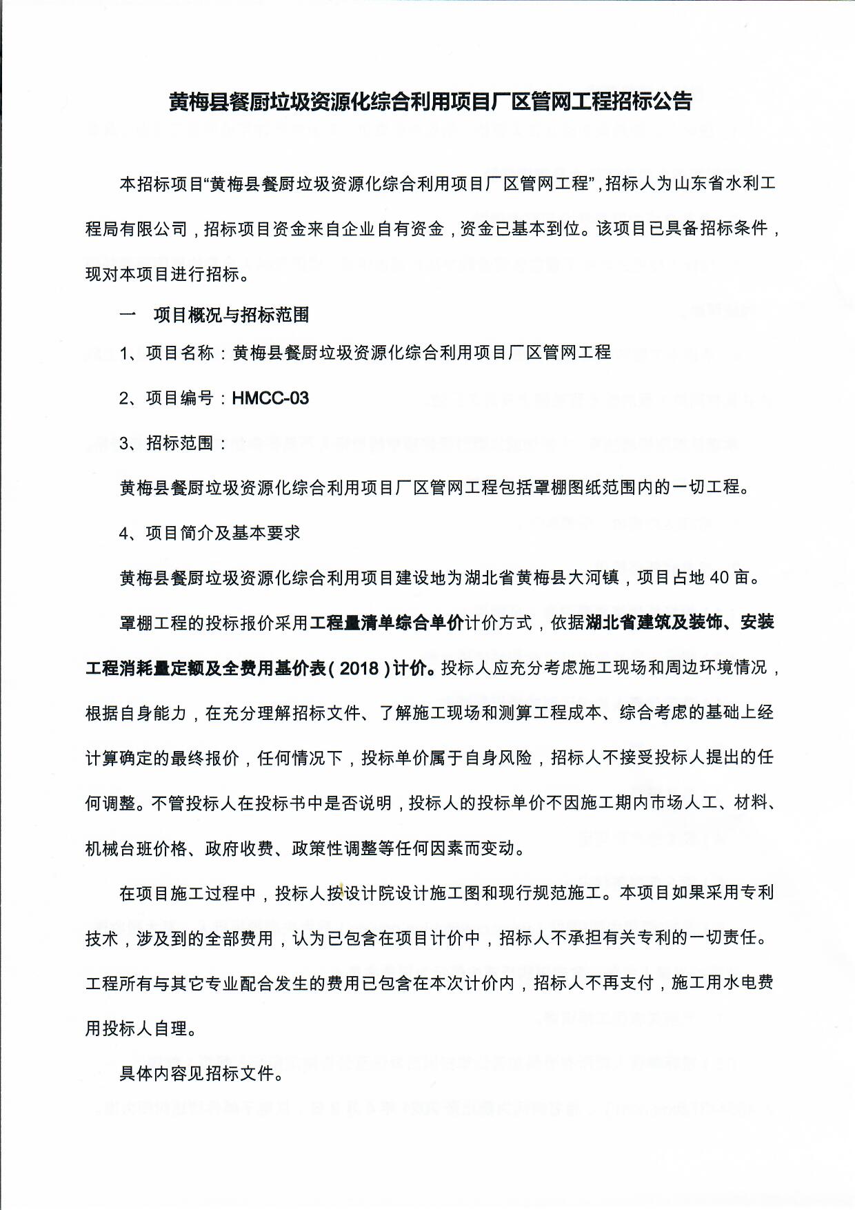 黃梅縣餐廚垃圾資源化綜合利用項目廠區(qū)管網(wǎng)工程招標公告