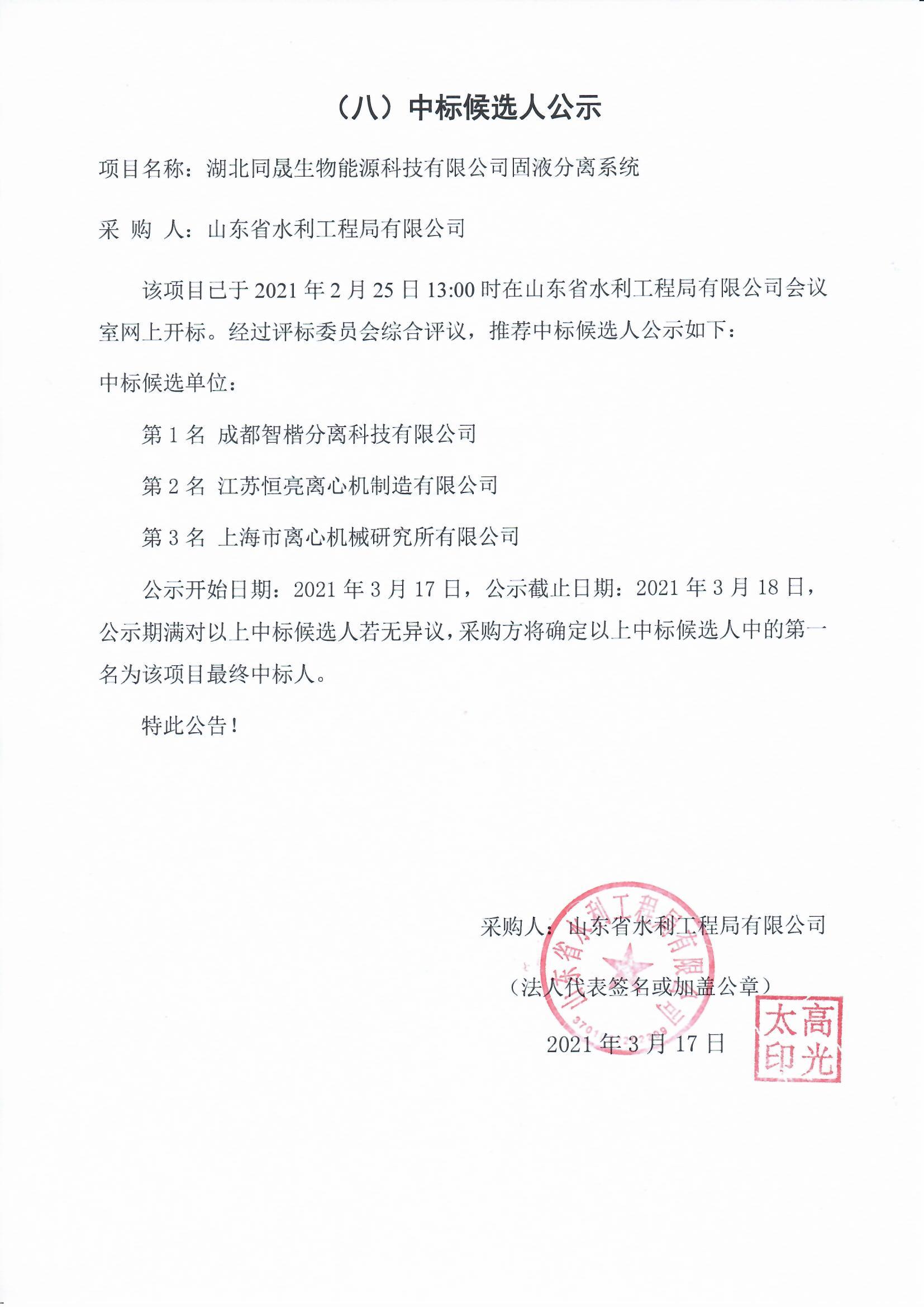 湖北同晟生物能源科技有限公司固液分離系統中標候選人公示