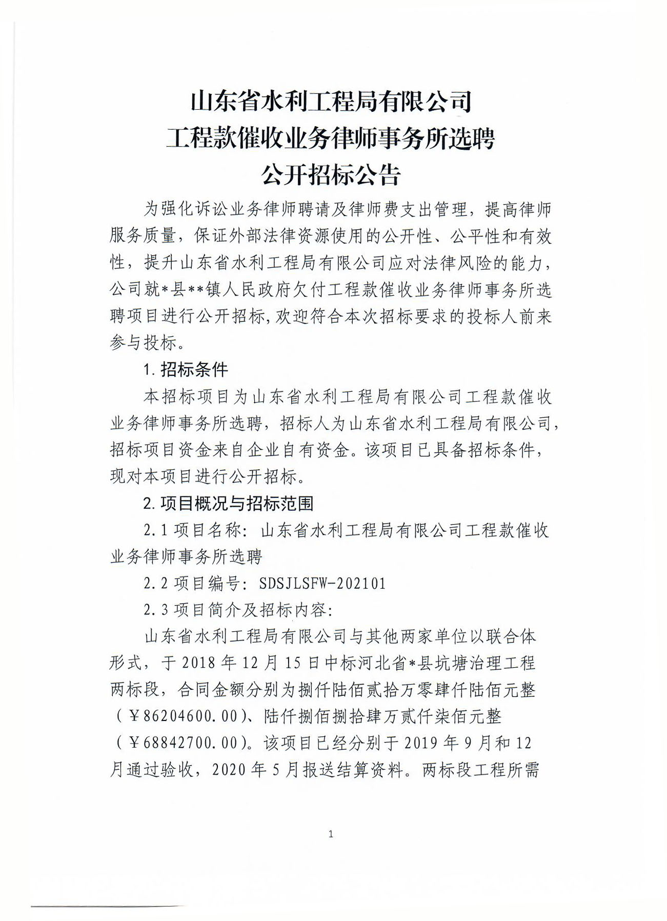 山東省水利工程局有限公司工程款催收業(yè)務(wù)律師事務(wù)所選聘公開招標公告