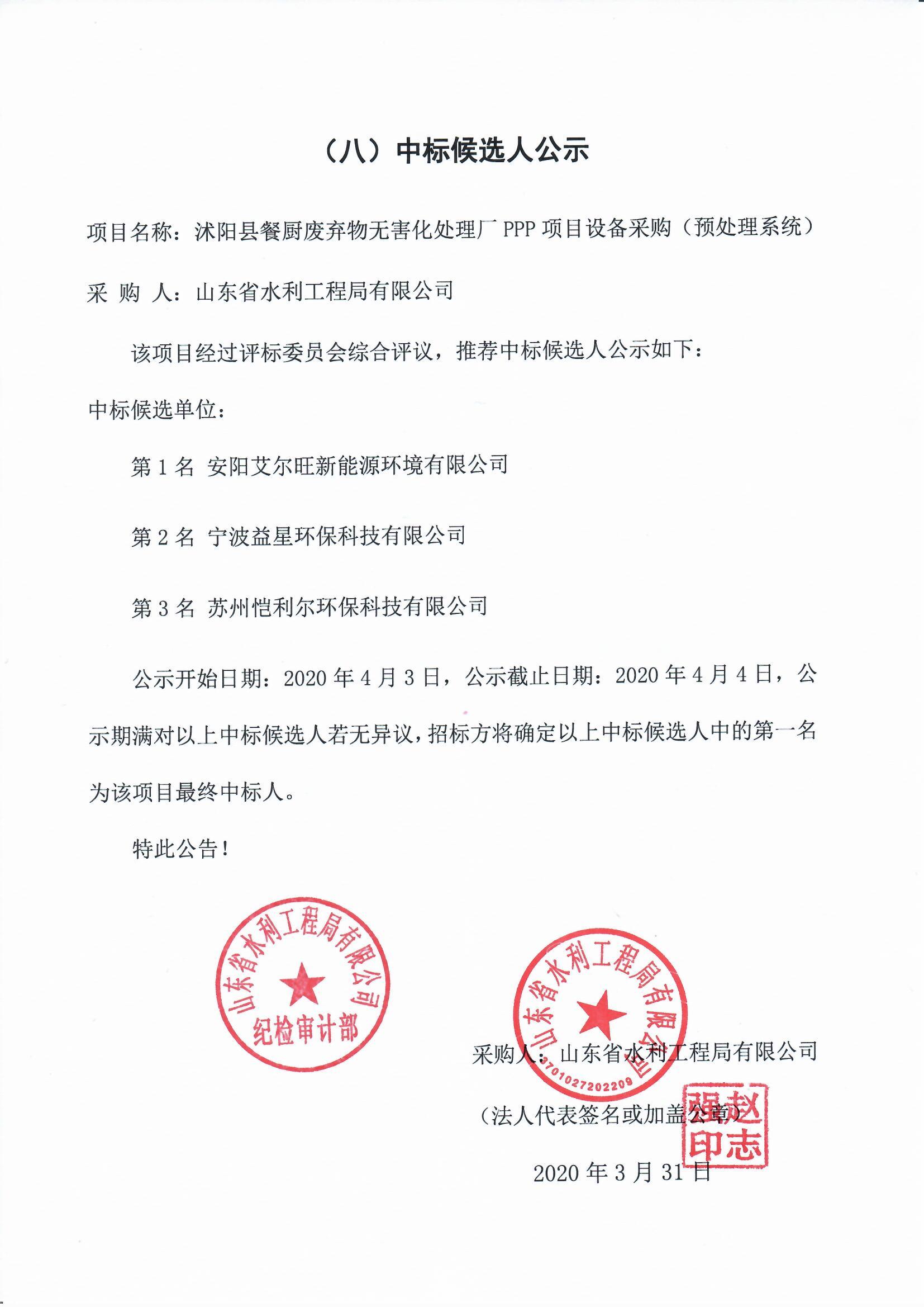 沭陽(yáng)縣餐廚廢棄物無(wú)害化處理廠PPP項(xiàng)目設(shè)備采購(gòu)(預(yù)處理系統(tǒng))中標(biāo)候選人公示
