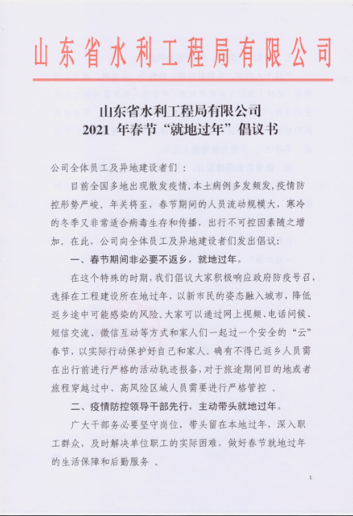 山東省水利工程局有限公司2021年春節(jié)“就地過年”倡議書
